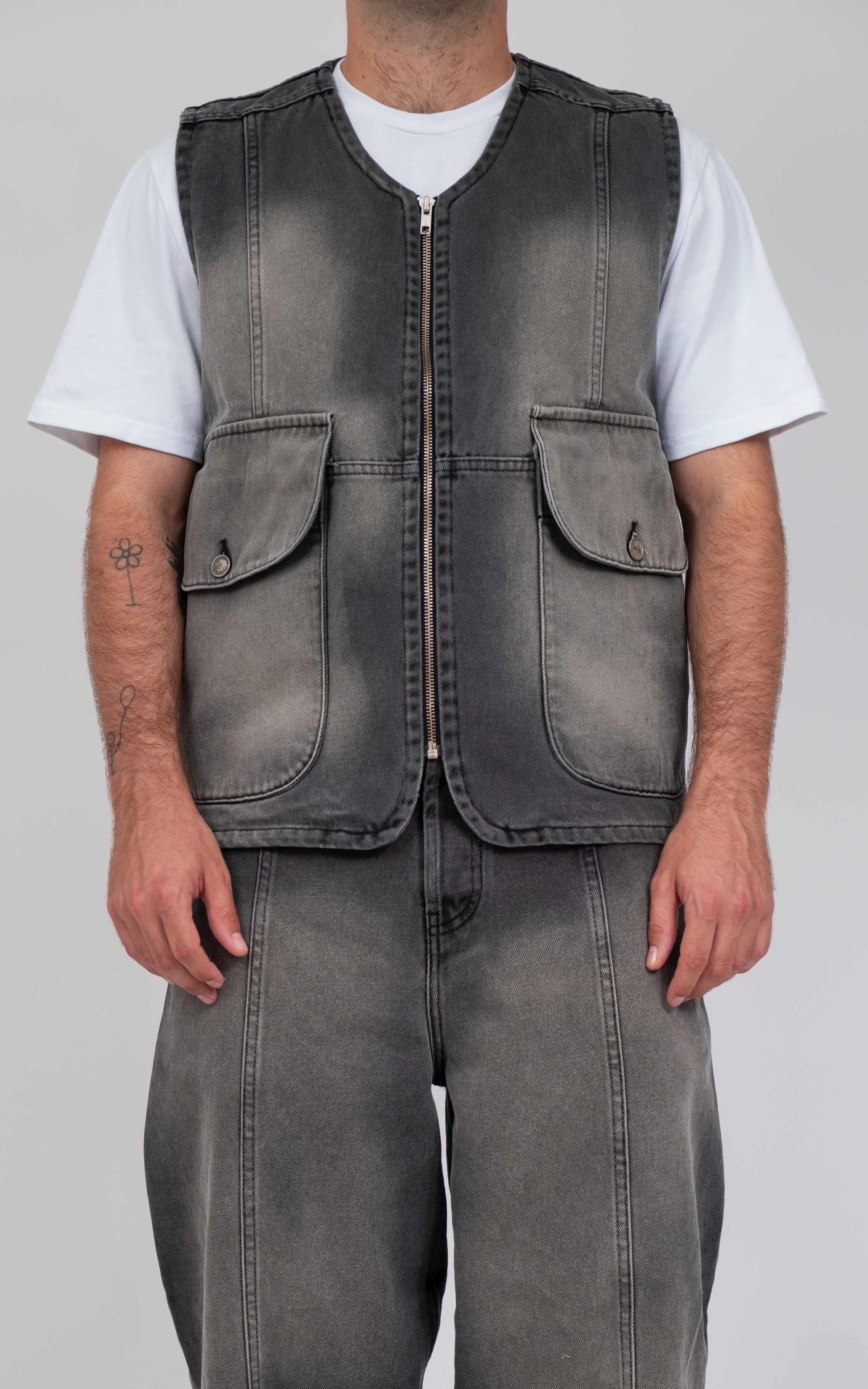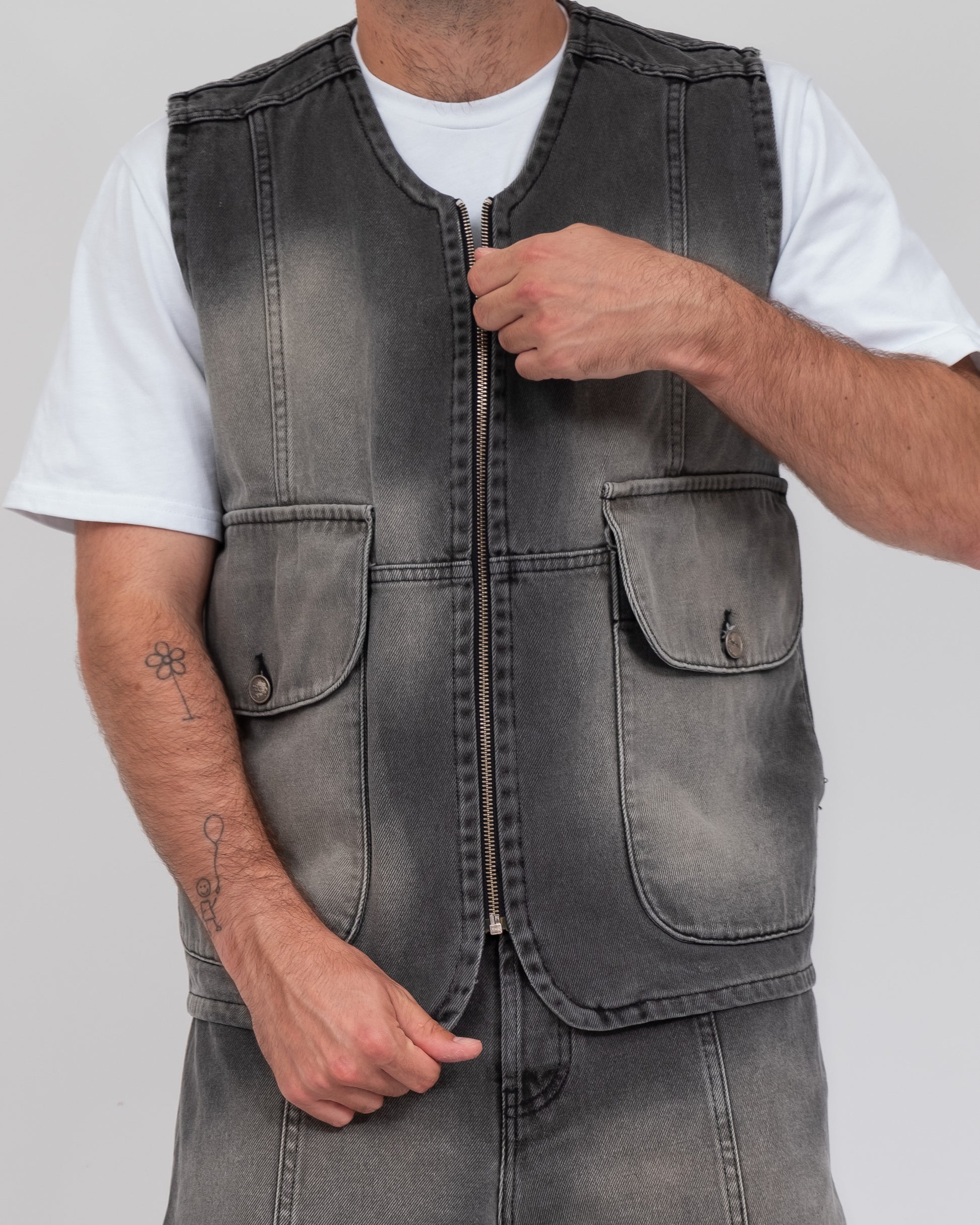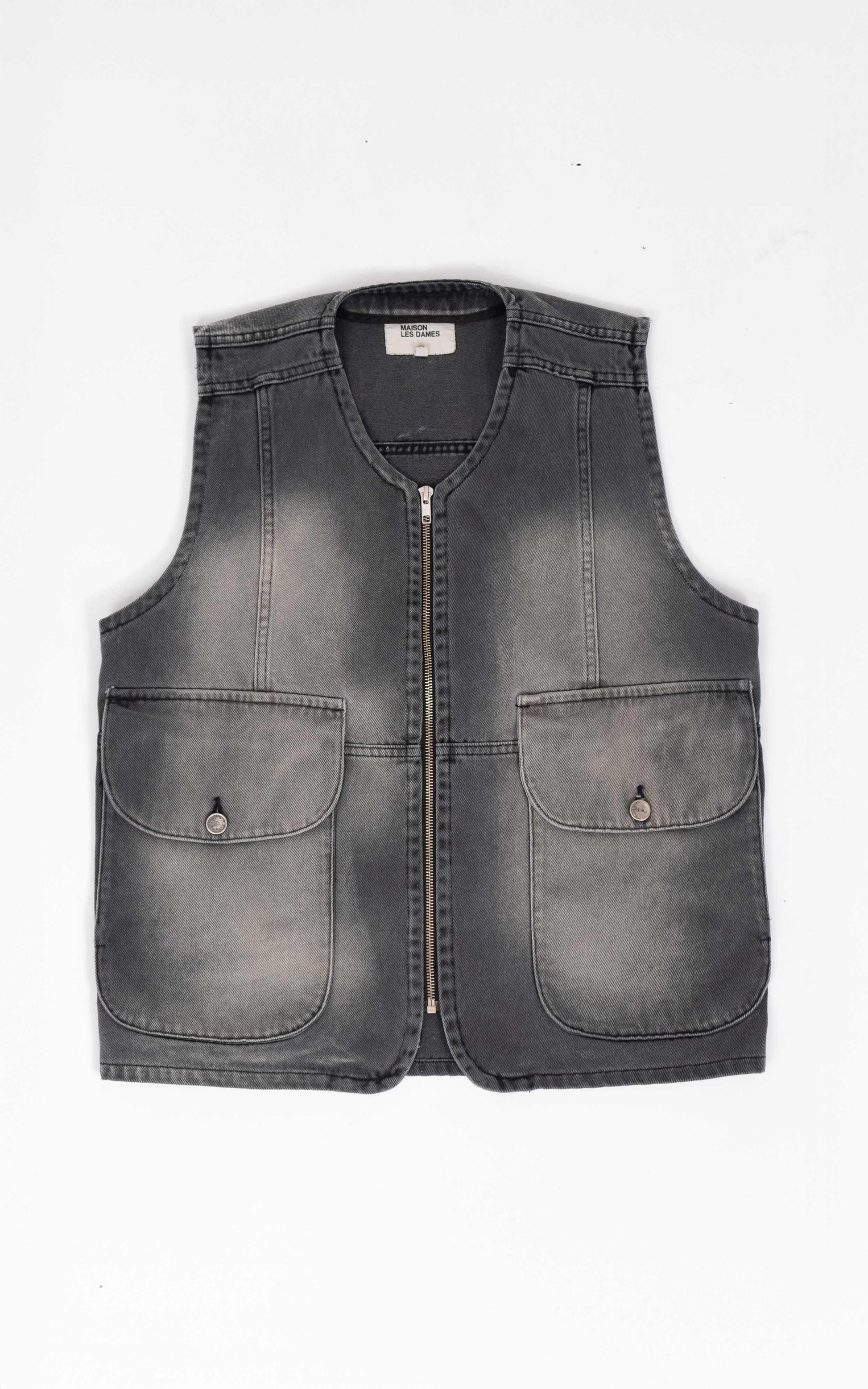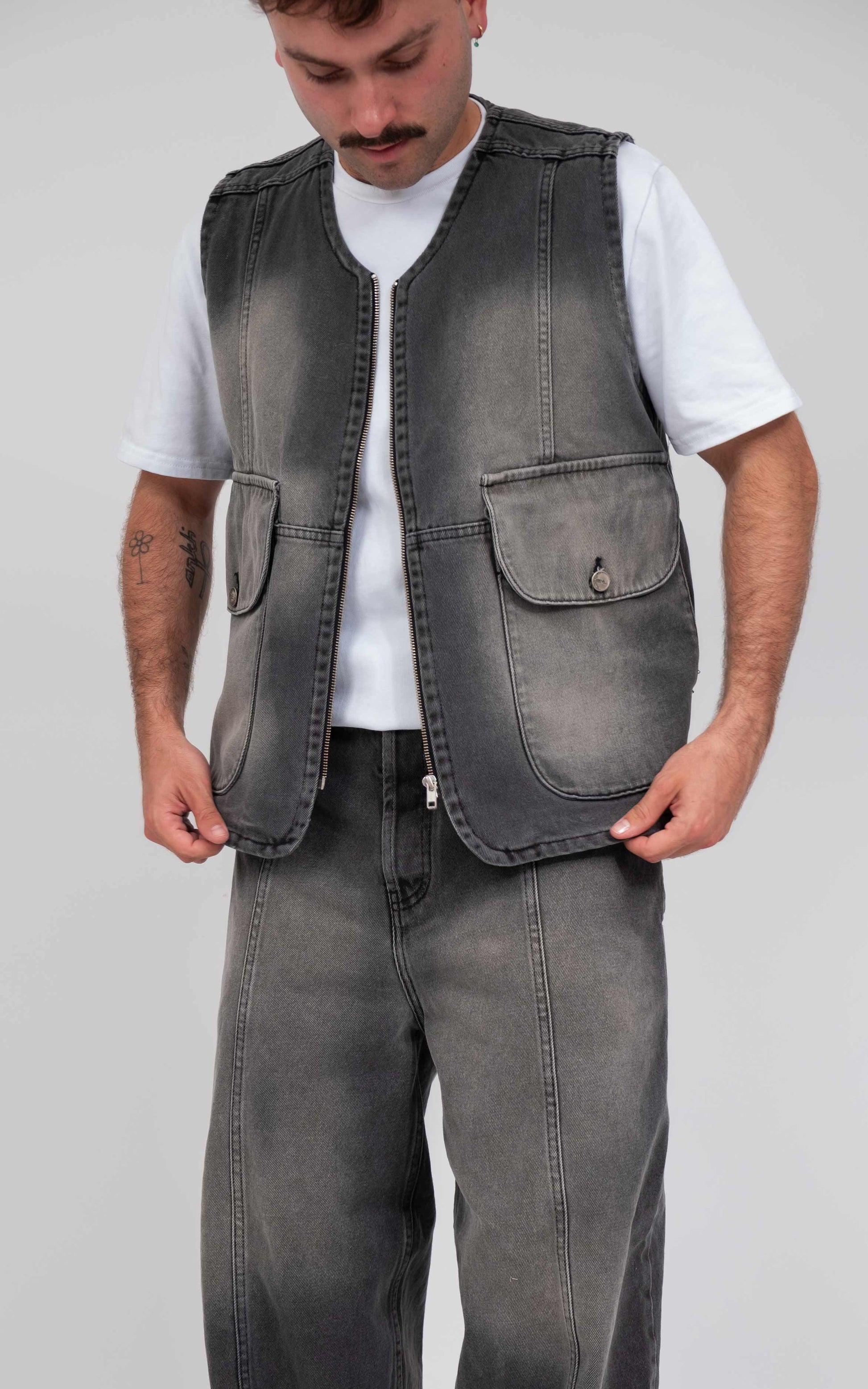 The Black Denim Vest is made from 100% GOTS certified cotton denim from Morocco. It is a thick and resistant fabric, which guarantees excellent hold to the jacket. There are also two flap pockets on the front of the jacket, with an opening on the side. The denim used to make this set is raw, meaning it has not undergone any treatment and the fabric is natural. The fabric therefore has a rather rigid drape, and acquires lighter shades of color which will make it authentic over time.