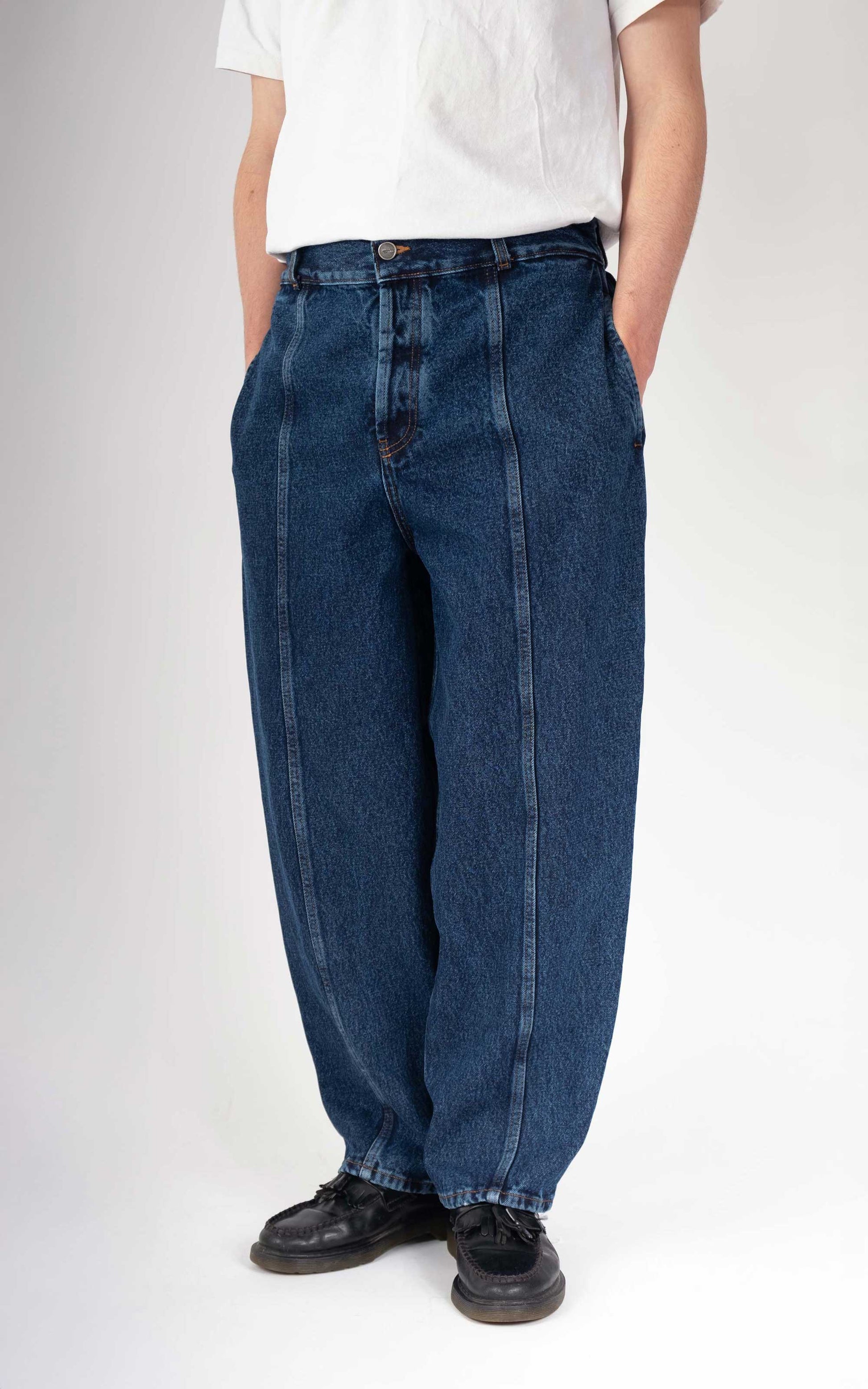 Made with 100% cotton denim , it offers a thick and durable fabric for a perfect fit and a super comfortable balloon cut . At the back, two large original pockets add a unique touch, while the front remains simple with two discreet pockets.