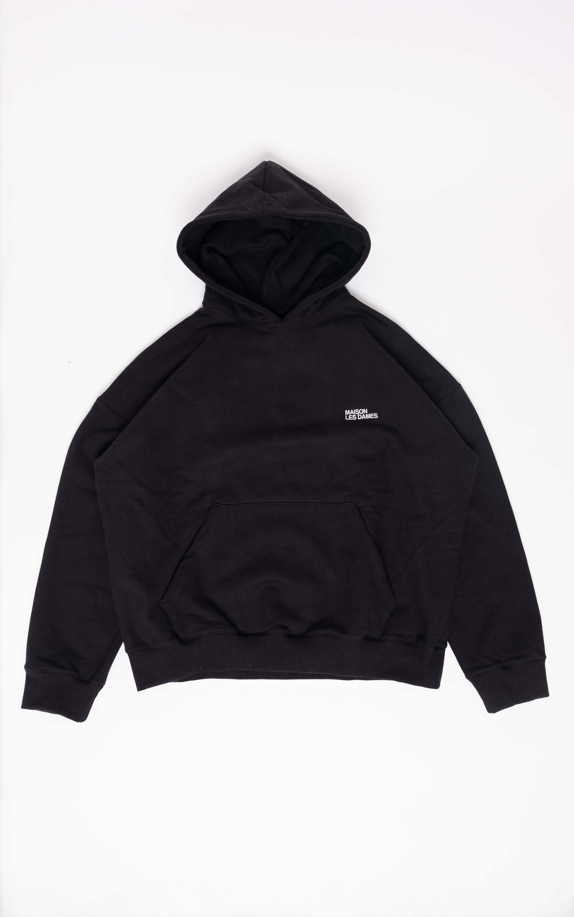 Le Sweat Brodé Noir is made from 100% cotton brushed fleece from England. This is a particularly thick and heavy fabric (500g/m² ) : the Sweatshirt weighs more than 1kg! The fleece is brushed on the back, which gives the Hoodie its soft and comfortable appearance. The cut is loose, and the armholes are low. At the bottom of the sweatshirt, the ribbing is not too tight, for better everyday comfort. It is a durable ribbing, with excellent elasticity, which will not move even after numerous washes. The hood is lined which gives it a nice hold.