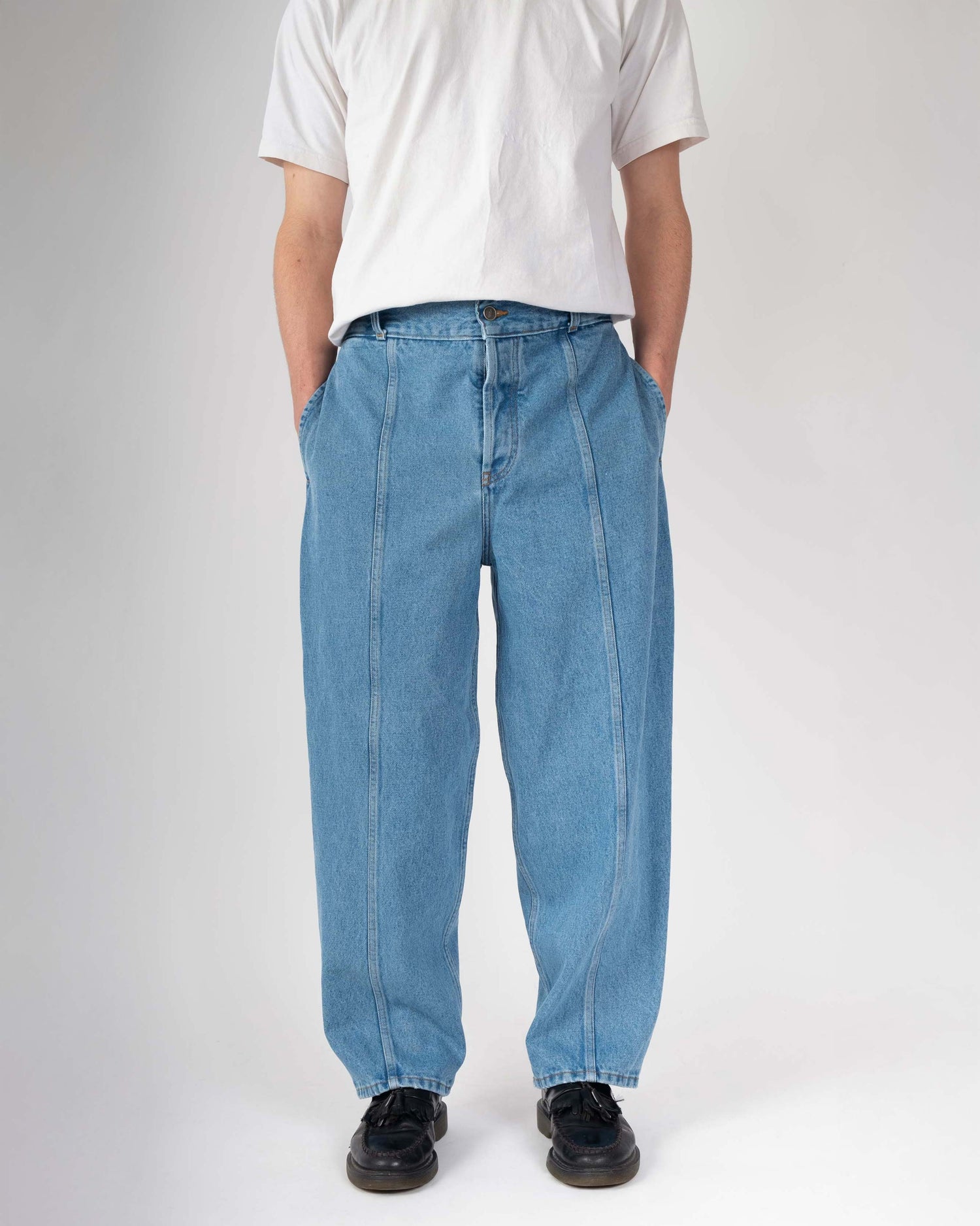 Le denim a subi un lavage stone wash (concept expliqué juste en-dessous), conservant ainsi une souplesse confortable et prenant cette couleur bleu clair.